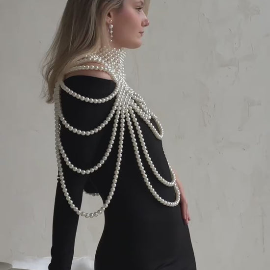 This couture-inspired pearl body chain cape is designed for women who appreciate the artistry of statement accessories. Featuring cascading layers of luminous faux pearls, it drapes gracefully over the shoulders and neckline, creating a silhouette that is both bold and sophisticated.
