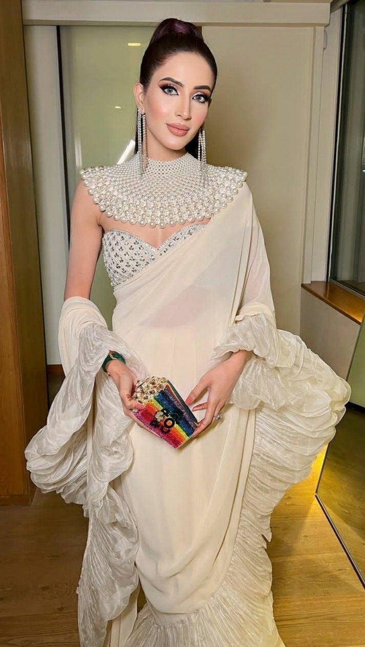 • Evening Gown or Saree – in neutral or soft tones to emphasize the pearls’ radiance